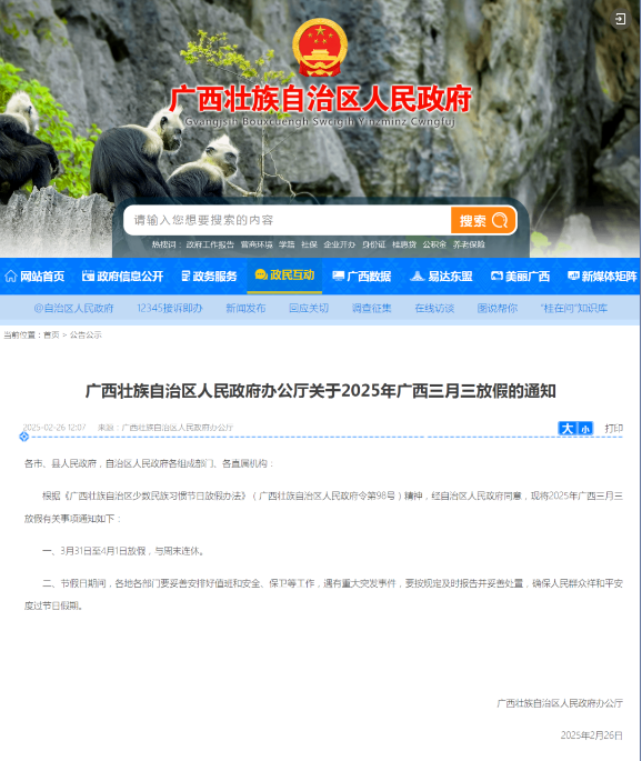 根据《广西壮族自治区人民政府办公厅关于2025年“壮族三月三”放假的通知》精神,结合我公司实际情况,现将放假安排通知如下: