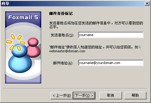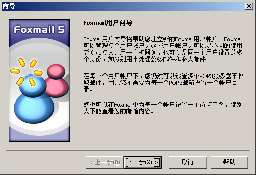 安装成功后,第一次运行Foxmail时软件会出现“Foxmail用户向导”用户可以通过此向导为自己设定一个用pop3方式接收邮件的yourdomain.com邮箱,点击“下一步”;