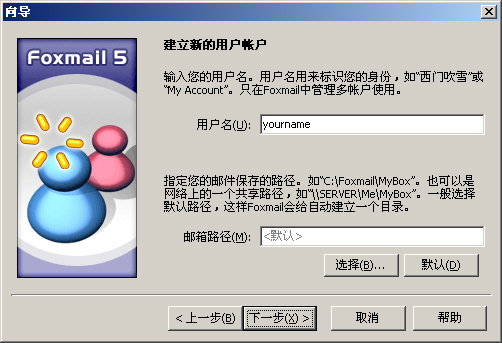 接着根据提示,输入在Foxmail中管理帐号的“用户名”,如:“yourname”,然后点击“下一步”;