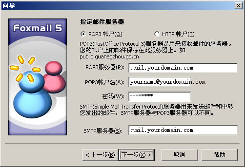 输入您邮箱的的POP3服务器和SMTP服务器地址:
