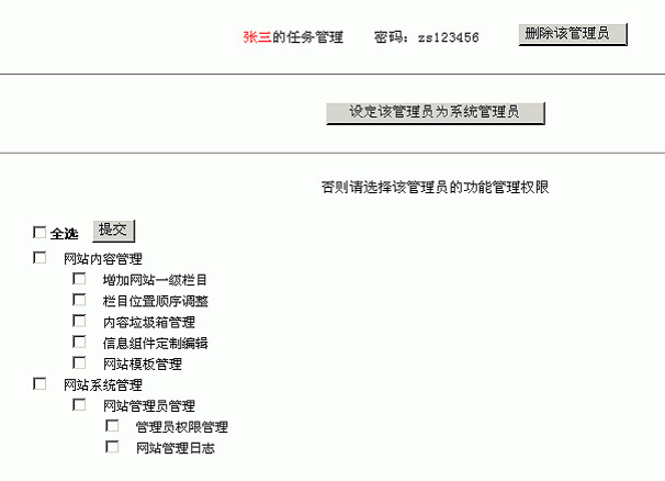 本系统的管理权限进行了简化设计,仅针对系统功能设定管理权限,也就是说一旦为该管理员分配了某项功能的管理权限,他就可以进行该功能的所有操作,并没有细分"读、写、修改"等操作权限。对于一般的管理员,可从下面的网站后台系统功能表中选定该管理员的管理权限,可多选。也可以在此取消该管理员的某项管理权限。分配完权限后,该管理员进入后台管理系统时只能看到他具有权限的功能菜单。