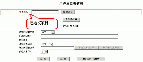 本系统支持无限多的用户反馈表的定制,管理员可以在界面下方添加新的反馈表。反馈表的名称可以填写诸如"售后服务反馈表"、"服务意见表"等,说明部分是对该反馈表进行简单的描述,如"调查的目的是什么?",让用户知道为什么要填这张表,填写后有什么结果,名称不能重复;反馈表有两种形式,一种是自动加入系统默认表单项,包括姓名、地址、电话和电子邮件四项,另一种形式就是全部项目自定义。