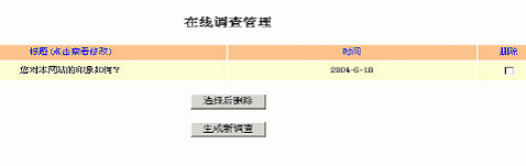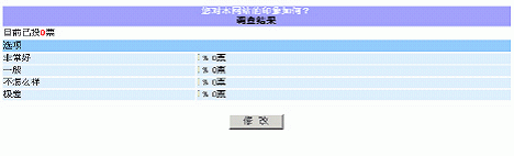 首先,网站管理员可以通过后台管理系统在线定义多个调查表,每个调查表可以定义最多8个答案选项以及单选或多选模式。可以在前台或者后台随时察看各个调查表的统计结果。