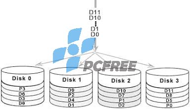 RAID 5 是一种存储性能、数据安全和存储成本兼顾的存储解决方案。 以四个硬盘组成的RAID 5为例,其数据存储方式如图4所示:图中,P0为D0,D1和D2的奇偶校验信息,其它以此类推。由图中可以看出,RAID 5不对存储的数据进行备份,而是把数据和相对应的奇偶校验信息存储到组成RAID5的各个磁盘上,并且奇偶校验信息和相对应的数据分别存储于不同的磁盘上。当RAID5的一个磁盘数据发生损坏后,利用剩下的数据和相应的奇偶校验信息去恢复被损坏的数据。
