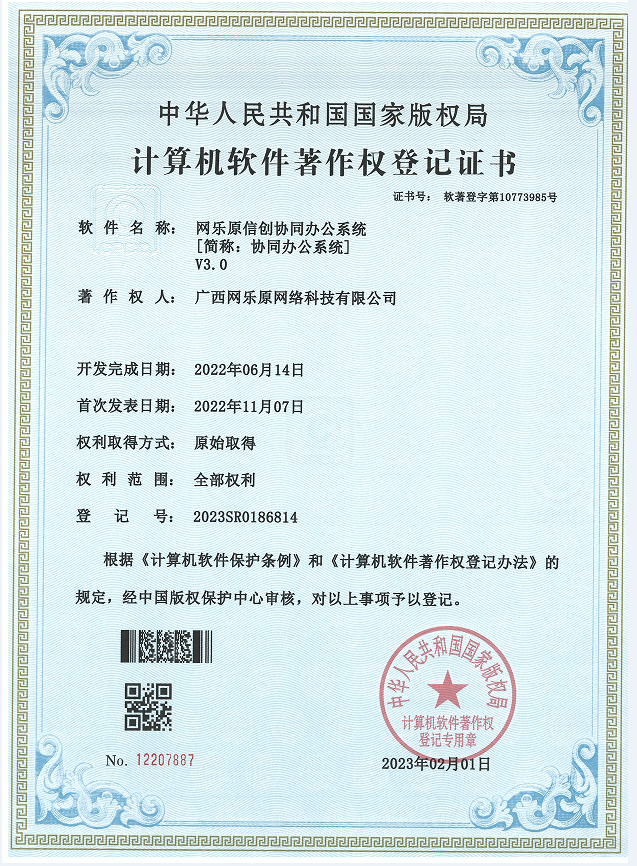 公司于近日取得由中华人民共和国国家版权局颁发的1项计算机软件著作权登记证书。软件名称:网乐原信创协同办公系统【简称:协同办公系统】V3.0网乐原信创协同办公系统V3.0可以...
