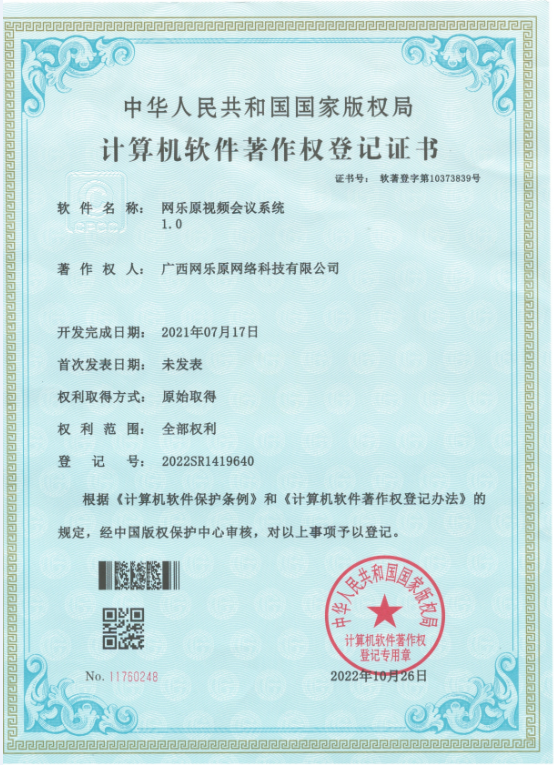 公司于近日收到了中华人民共和国国家版权局颁发的1项计算机软件著作权登记证书。软件名称:网乐原视频会议系统1.0网乐原视频会议系统1.0可以用于日常会议、工作报告、远程教...